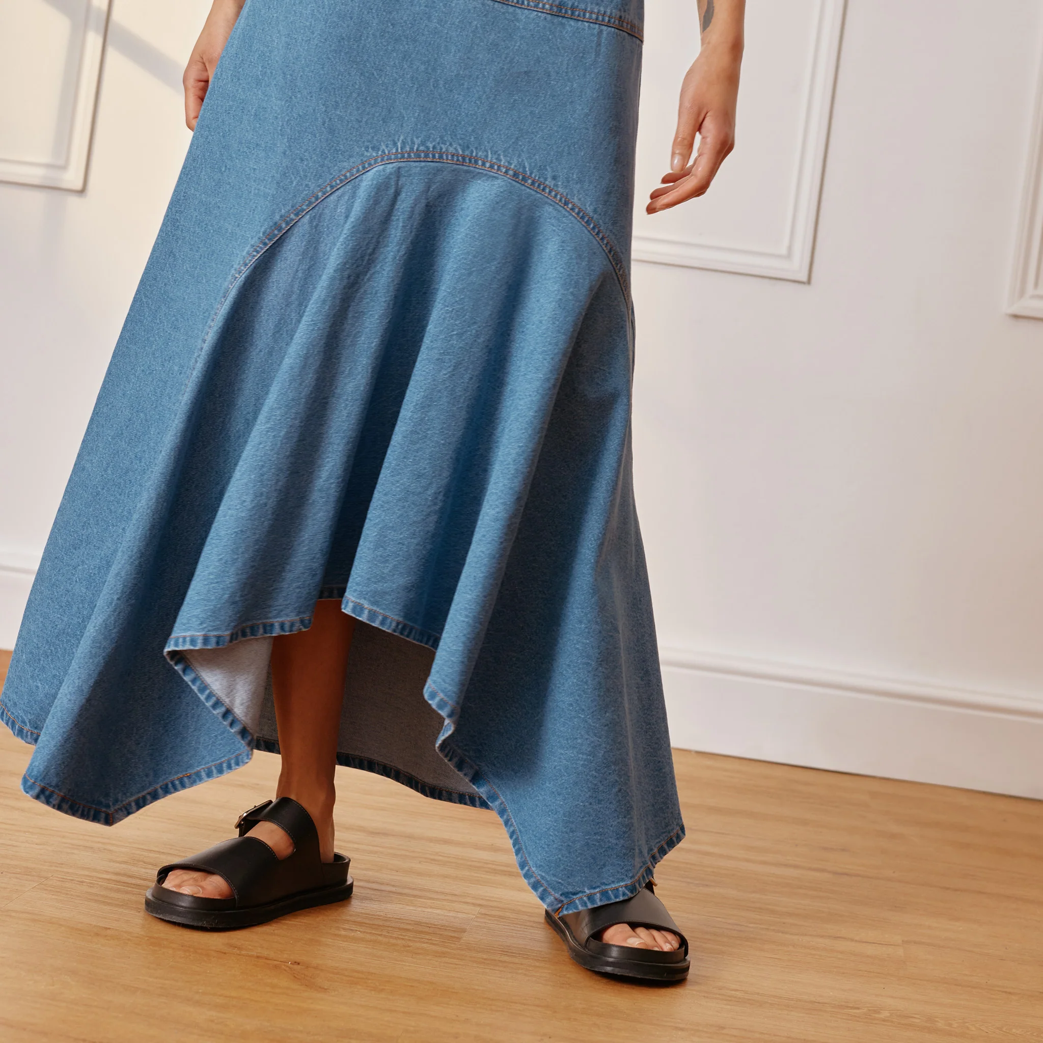 Crafted in a vintage wash denim, this skirt is cut in a classic five pocket jean design. Featuring a dropped waist and a draped skirt that flatters with a dipped hemline.