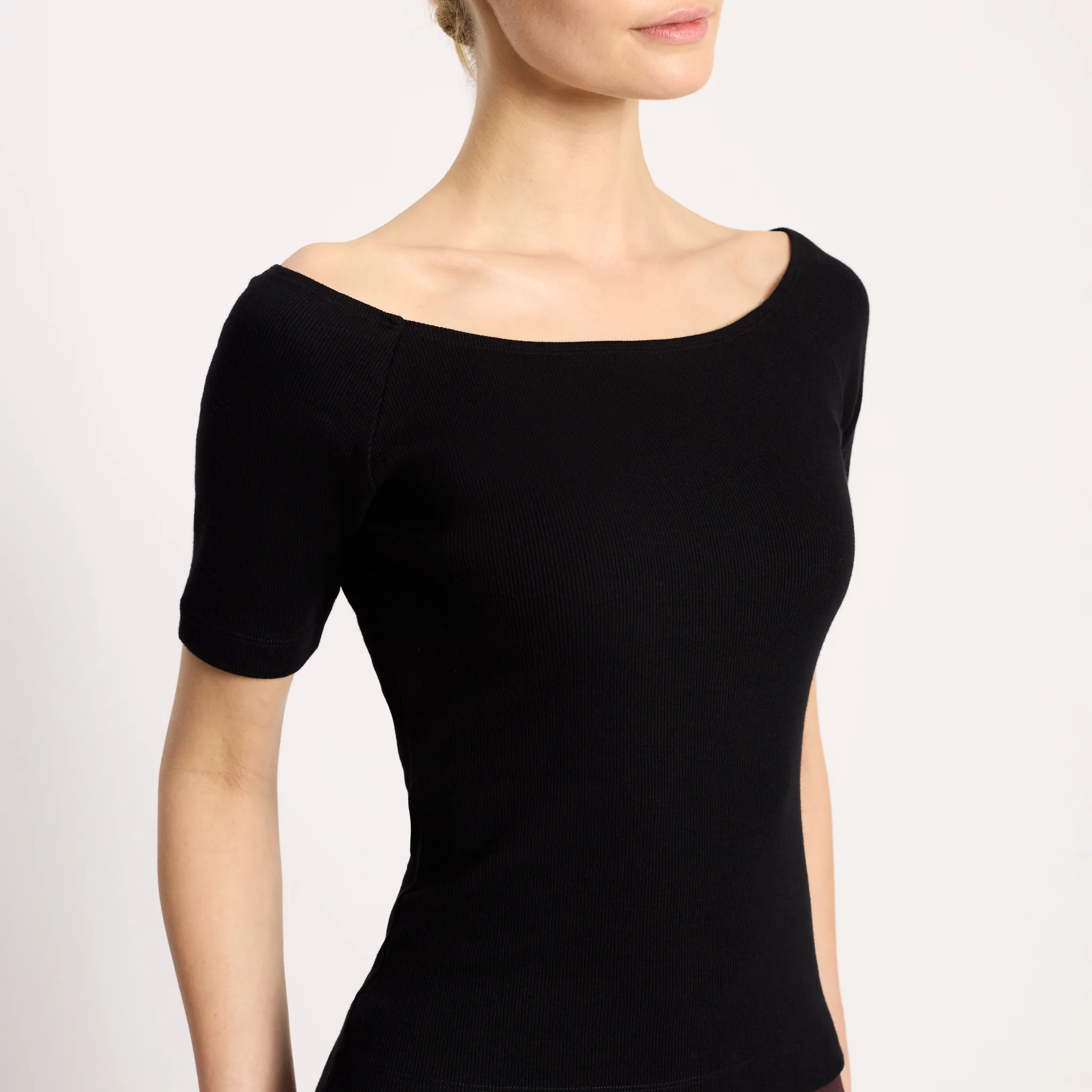 A versatile top designed with a flattering bardot neckline. Crafted in soft and sustainable cotton, this black rib jersey top is sure to become a wardrobe staple. The elegant bardot neckline flatters your form and adds a chic touch to any outfit.