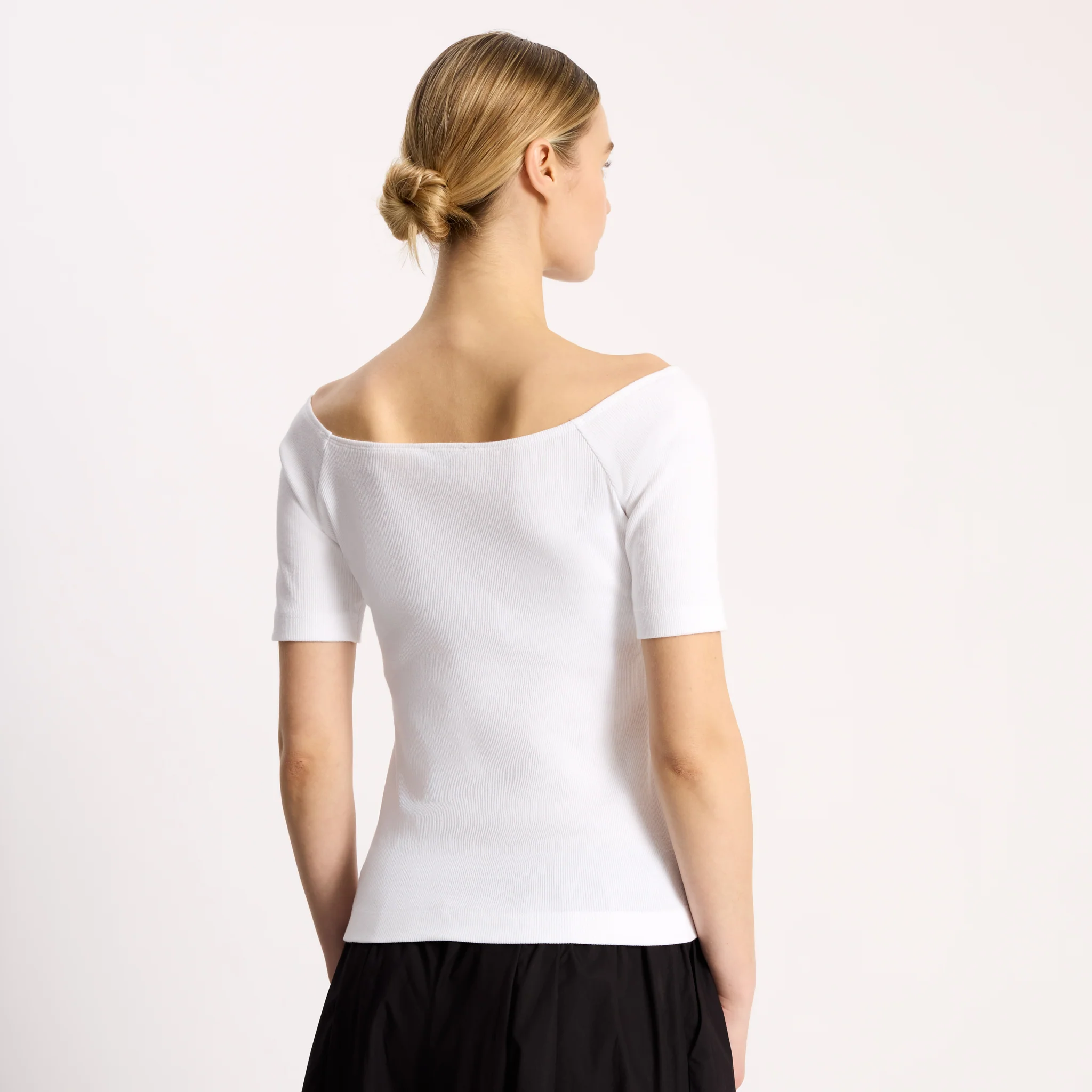 A versatile top designed with a flattering bardot neckline. Crafted in soft and sustainable cotton, this white rib jersey top is sure to become a wardrobe staple. The elegant bardot neckline flatters your form and adds a chic touch to any outfit.