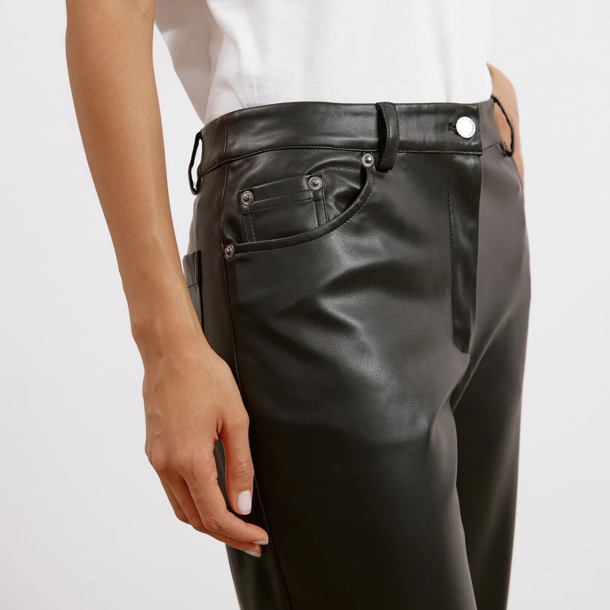 Featuring a classic 5 pocket jean styling and a straight leg, these jeans are made from soft faux leather for a comfortable fit and feel. Both timeless and durable, you can wear these jeans for seasons to come. Elevate your wardrobe with these versatile and stylish Faux Leather Jeans.