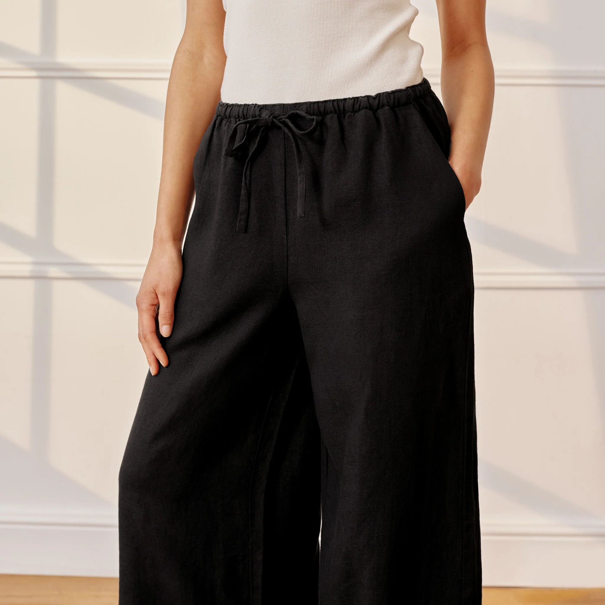 Relaxed linen trousers with a soft elastic waistband and tie detail and featuring side pockets. Crafted from the softest 100% linen, these trousers are super comfortable on a warm summer's day.