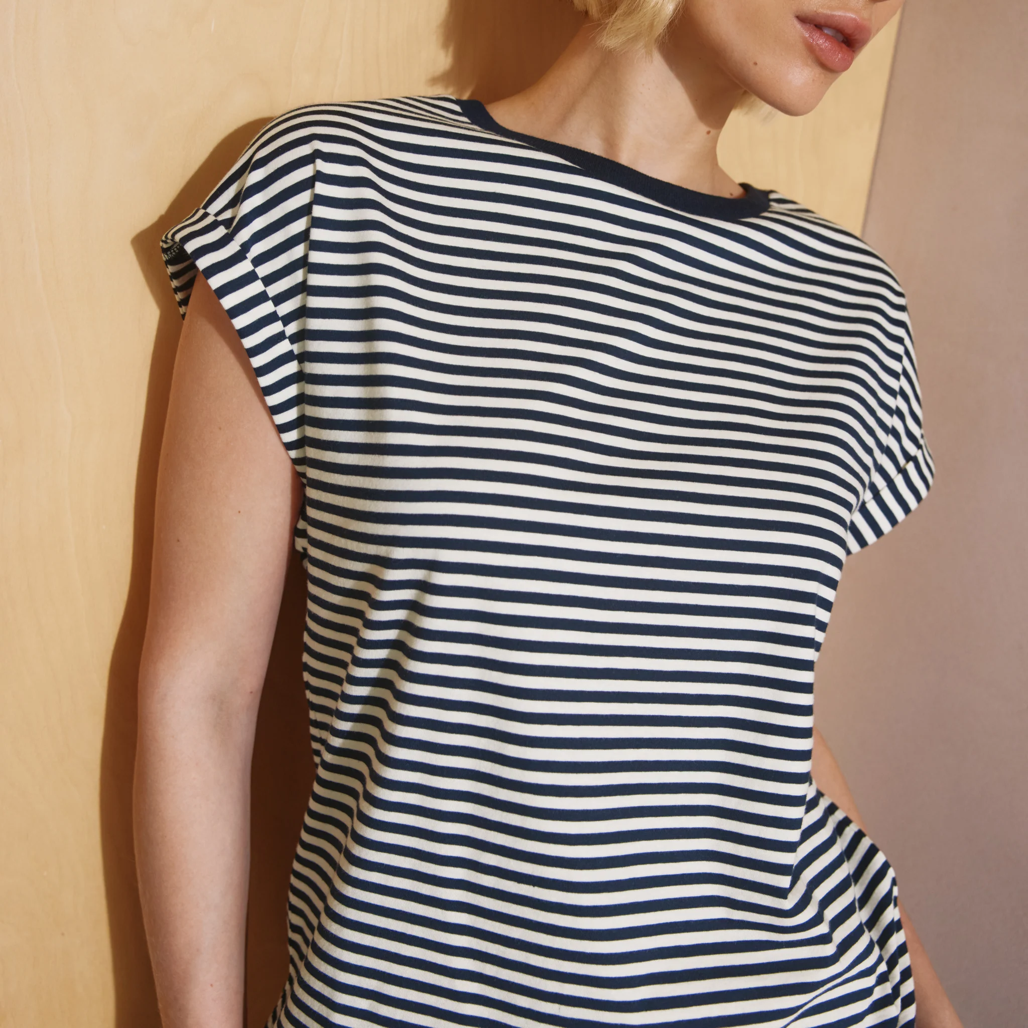 Crafted from soft, sustainable Greek cotton, this T-shirt offers a relaxed fit with a drop shoulder and roll back cuff. In a classic navy and white stripe, it is a comfortable and stylish choice that pairs perfectly with jeans.
