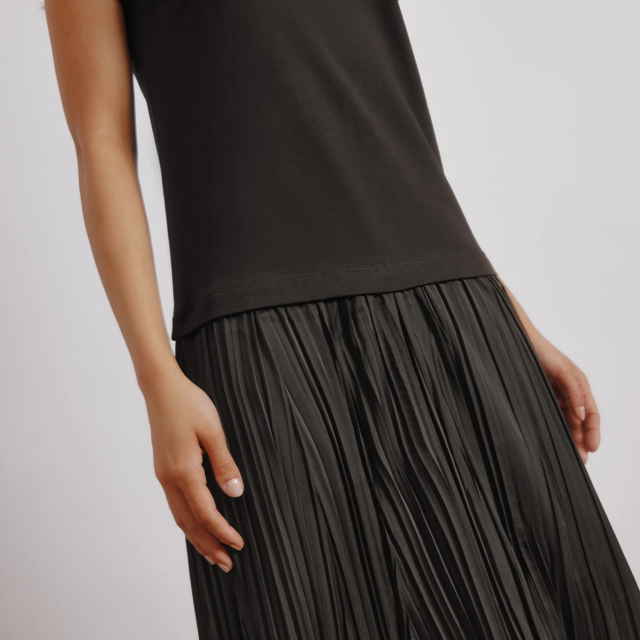 Combining both comfort and elegance, this midi dress features a soft jersey T-shirt with a luxurious plisse woven skirt in a rich chocolate tone. The satin plisse fabric creates subtle dimension and movement while maintaining a refined silhouette. Exceptionally versatile for various occasions, this dress effortlessly transitions from casual daywear when paired with sandals to an elevated evening outfit when styled with heels.Ā