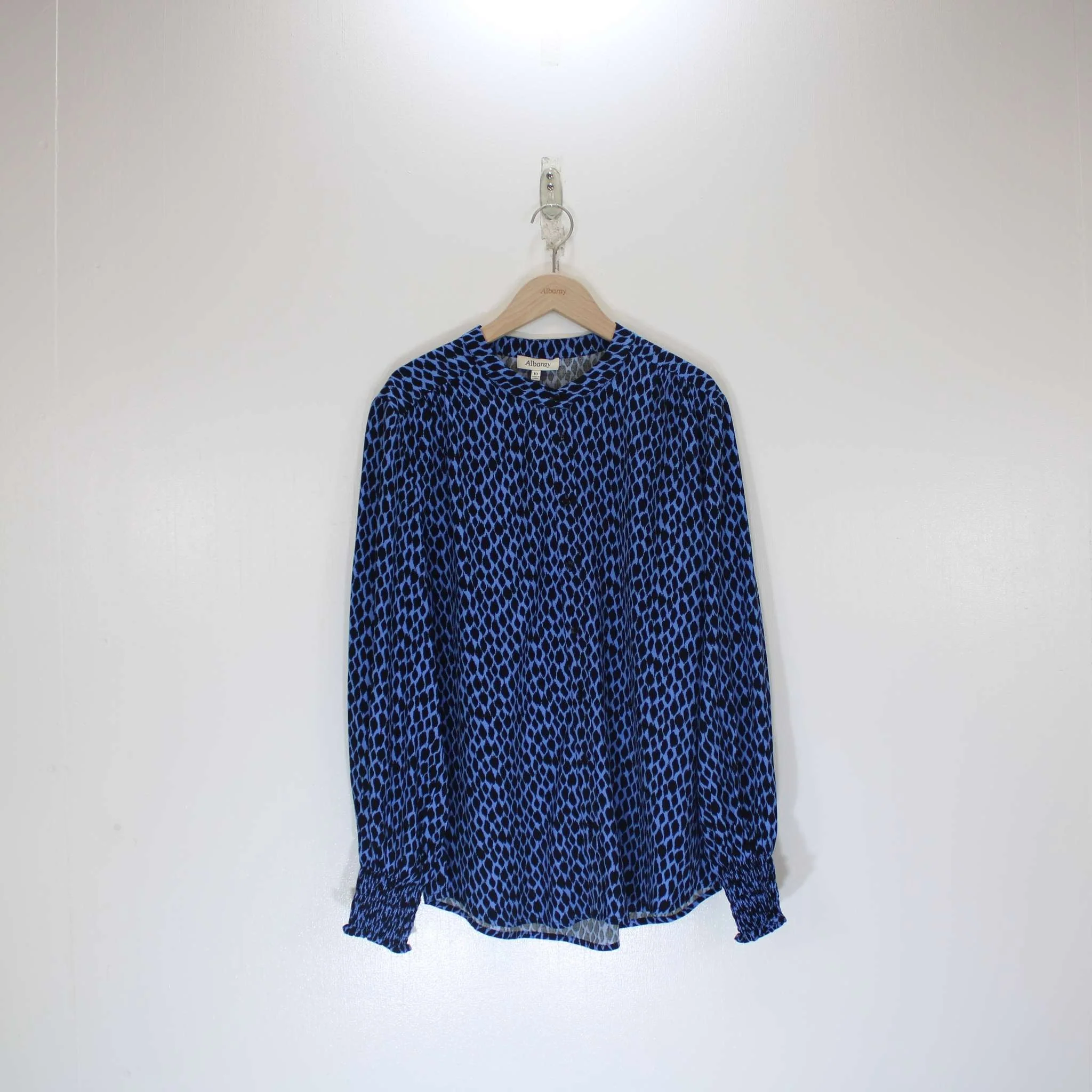 A relaxed fitting blouse with a stand collar. Featuring gently blouson sleeves with soft shirred cuffs. Crafted from the softest ECOVERO⢠viscose in a black and blue ikat print.