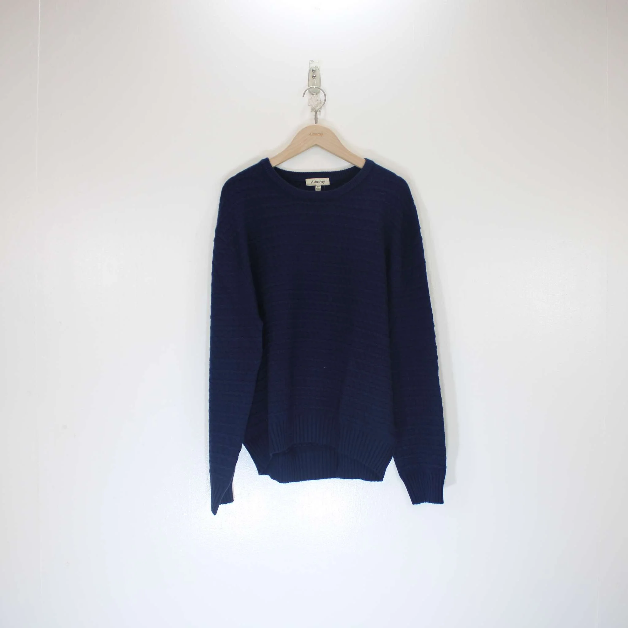 Embrace enduring comfort and style with this pre-loved relaxed crew neck jumper, intricately knitted with a soft bobble texture in a classic French navy hue. This versatile piece is destined to be a timeless staple in your wardrobe, offering both cosiness and style.