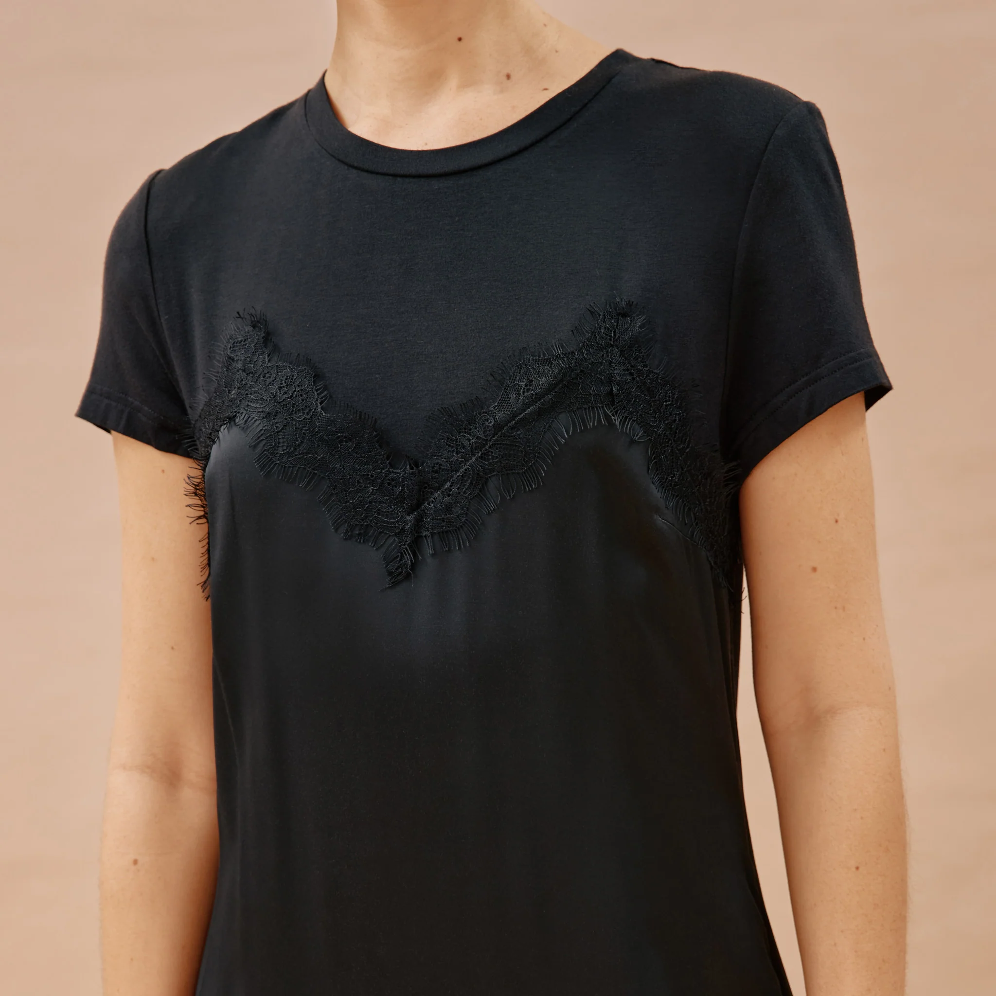 This dress is a perfect blend of everyday comfort and elegant style. A soft jersey T shirt in black styled with a satin dress and a delicate lace trim. Designed with side splits, you'll feel effortlessly glamorous.