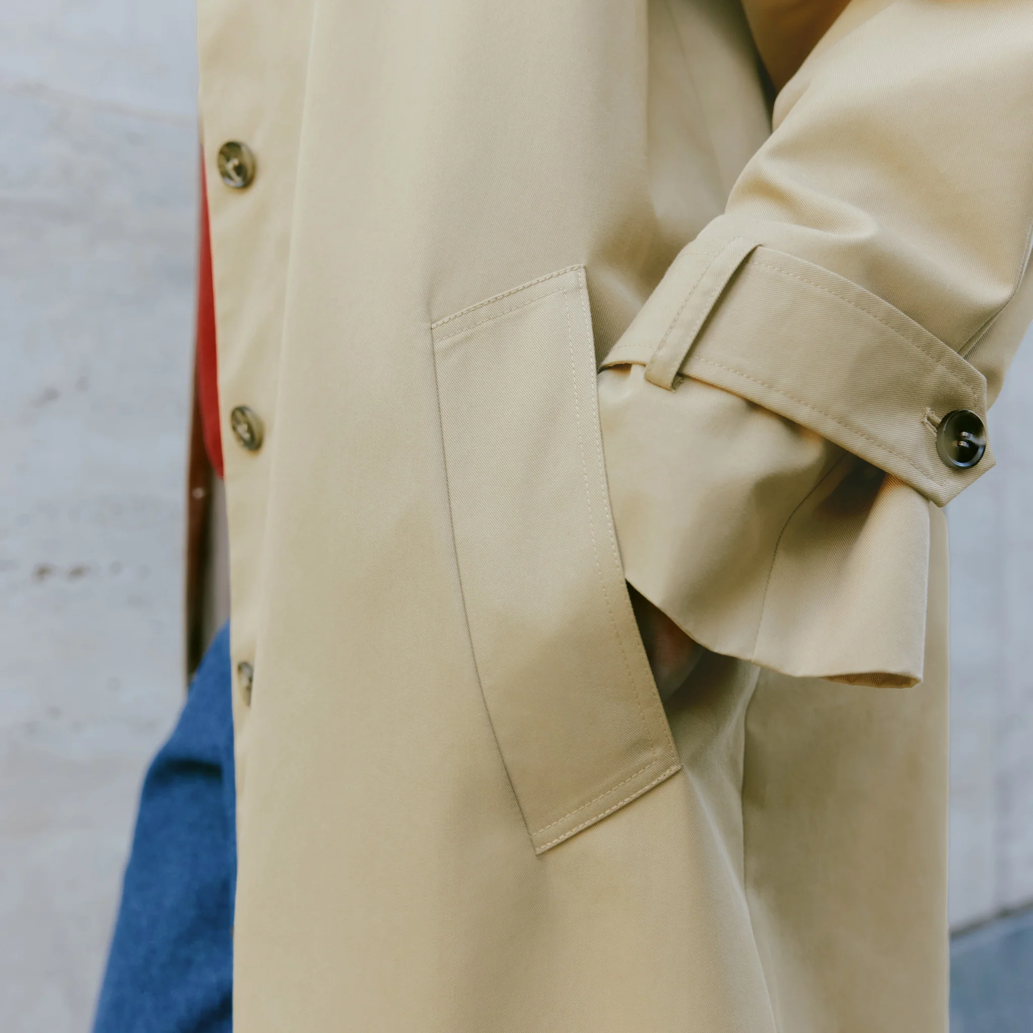 A Relaxed Trench Coat, expertly crafted from organic cotton in a classic stone colour. This single-breasted design, complemented by raglan sleeves and a back vent, effortlessly blends comfort and style. Belted cuffs, slanted welt pockets, and horn-effect buttons add subtle details to this timeless wardrobe essential.