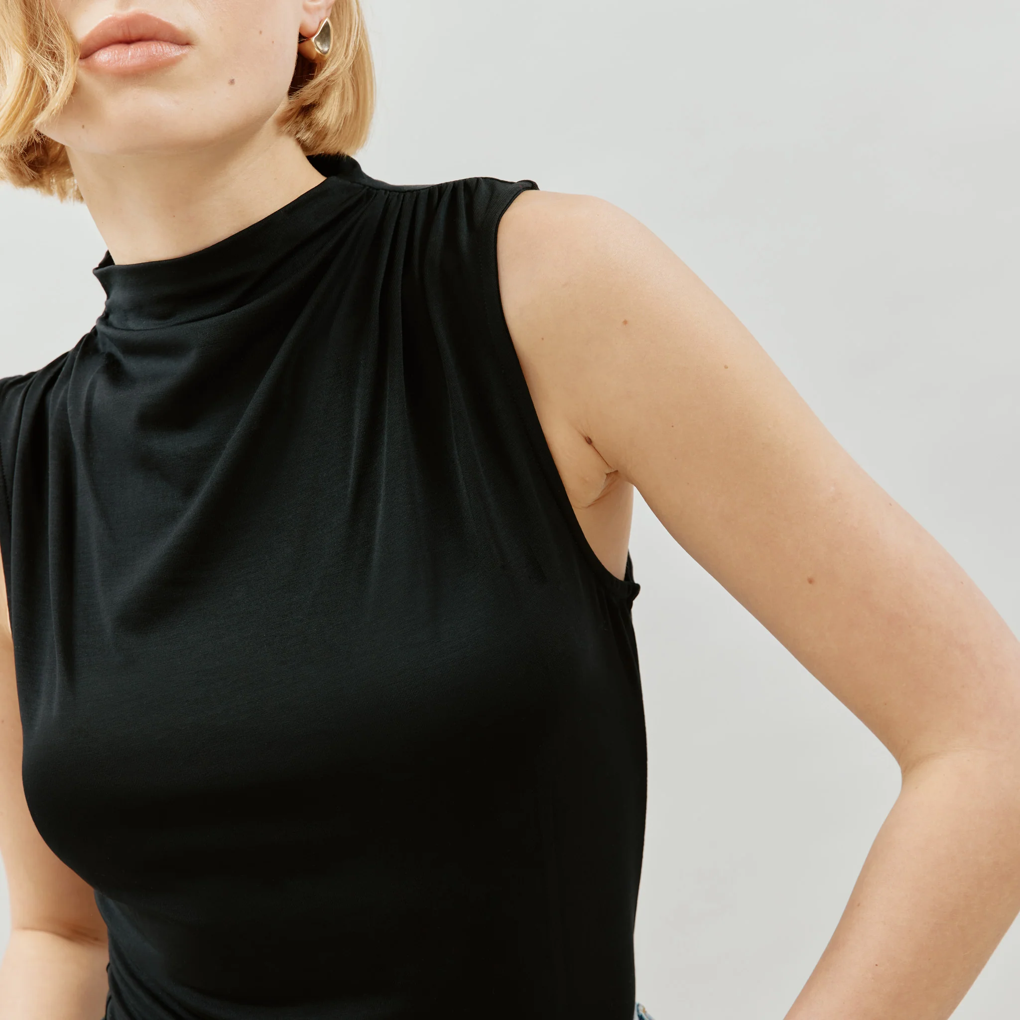Our bestselling sleeveless ruched turtle neck top returns, a luxurious and sophisticated addition to your wardrobe. The soft slinky jersey fabric in black offers comfort and elegance, while the ruched neck adds a touch of refinement. Elevate your style with this premium top.