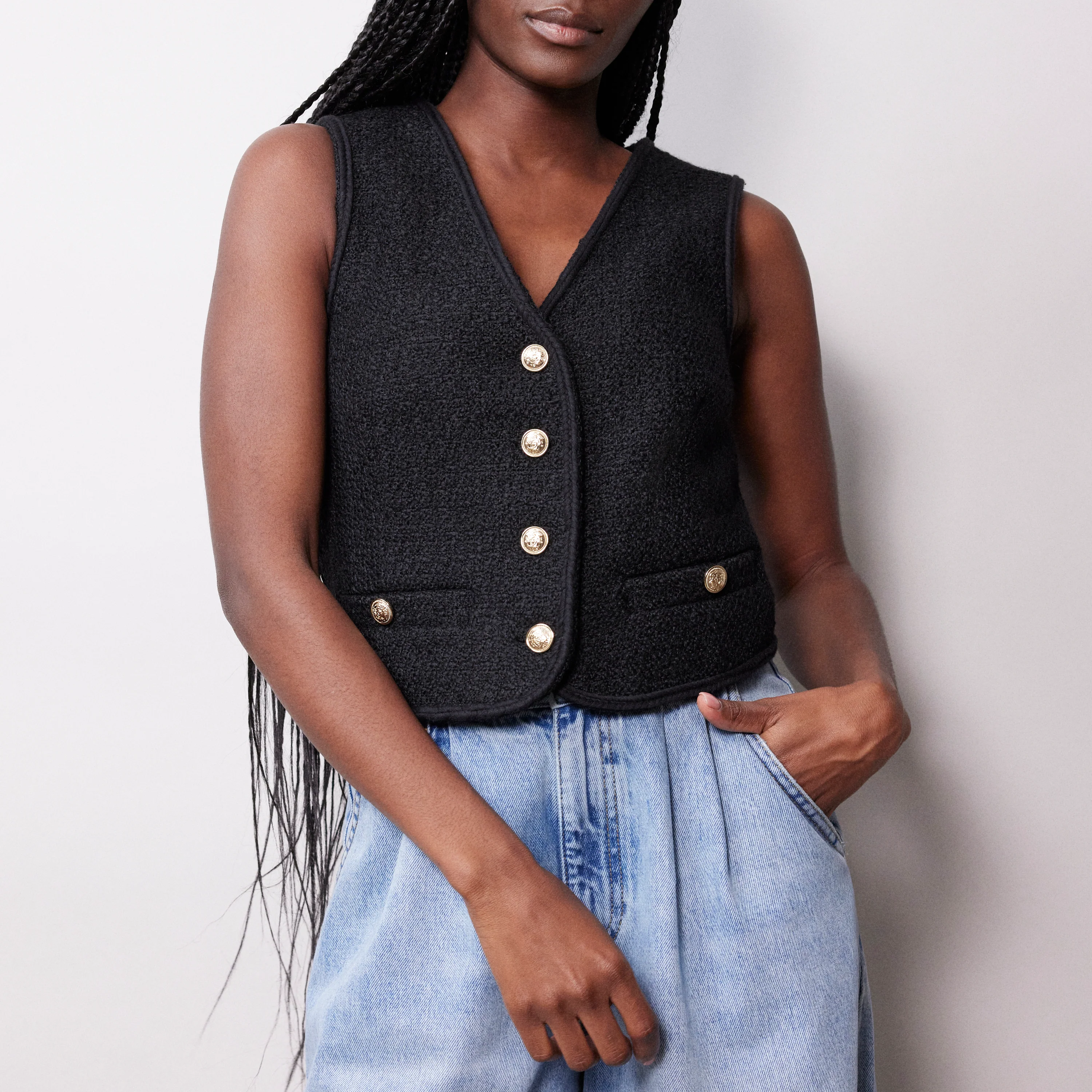 Timelessly elegant, this textured black tweed waistcoat is crafted from a soft wool blend. Featuring a V-neckline, jet pockets and crested gold buttons, adding a touch of sophistication. Fully lined for a luxurious feel against skin. Wear with jeans for a smart-casual vibe or pair with the matching tweed skirt for a more polished look.
